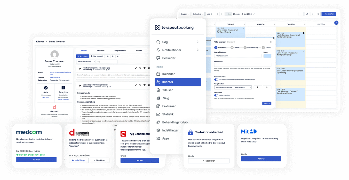 Terapeut Booking: Booking, journalføring, fakturering, rapporter og sikker kommunikation i ét system.
