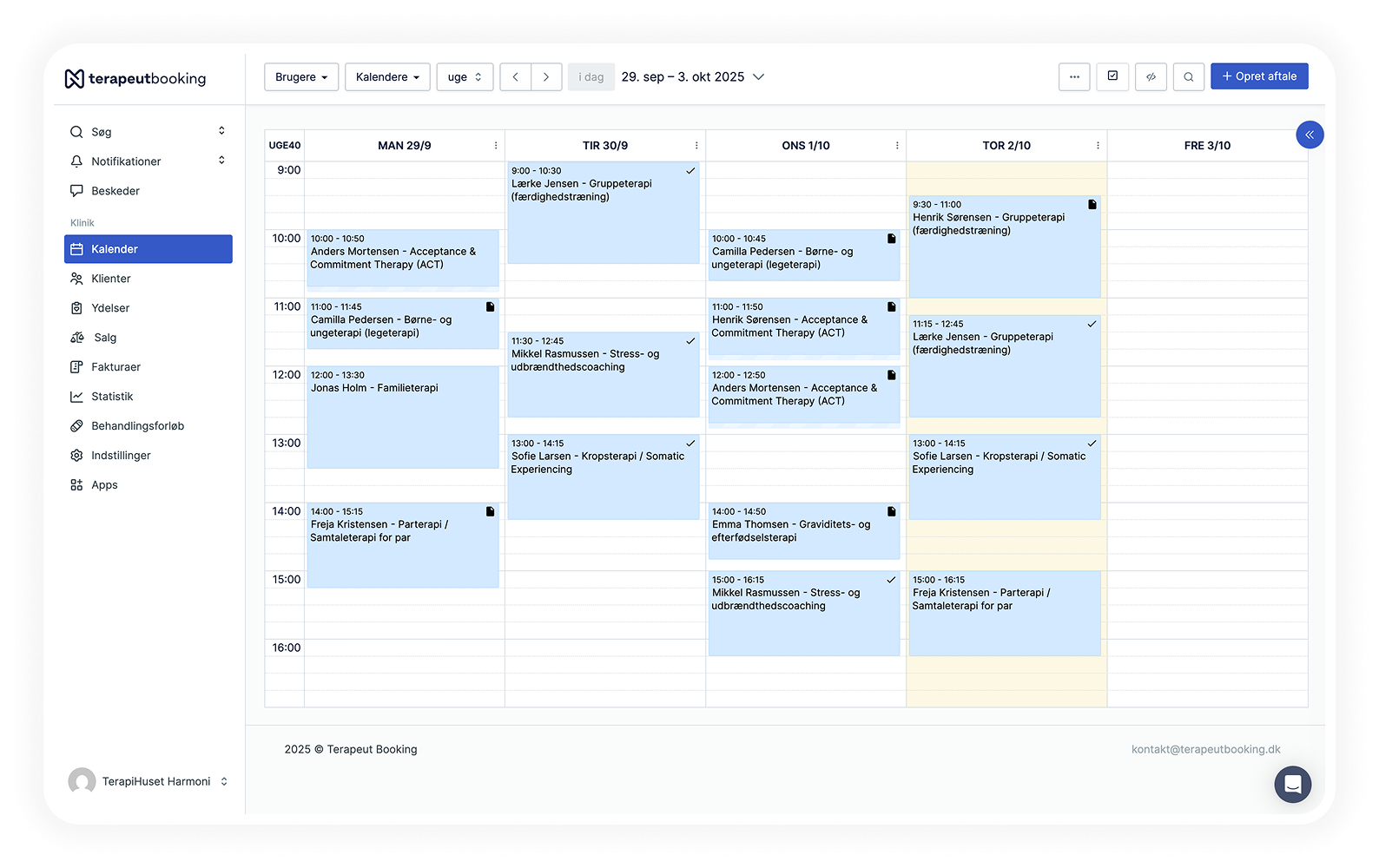 Med Terapeut Booking har du alt, du skal bruge til effektiv klinikdrift samlet ét sted. Udover aftale- og klienthåndtering, fakturering og meget mere, kan du yderligere integrere Terapeut Booking med eksterne ydelser såsom Google Calendar, e-conomic, MedCom og mange flere. Nemt og enkelt.