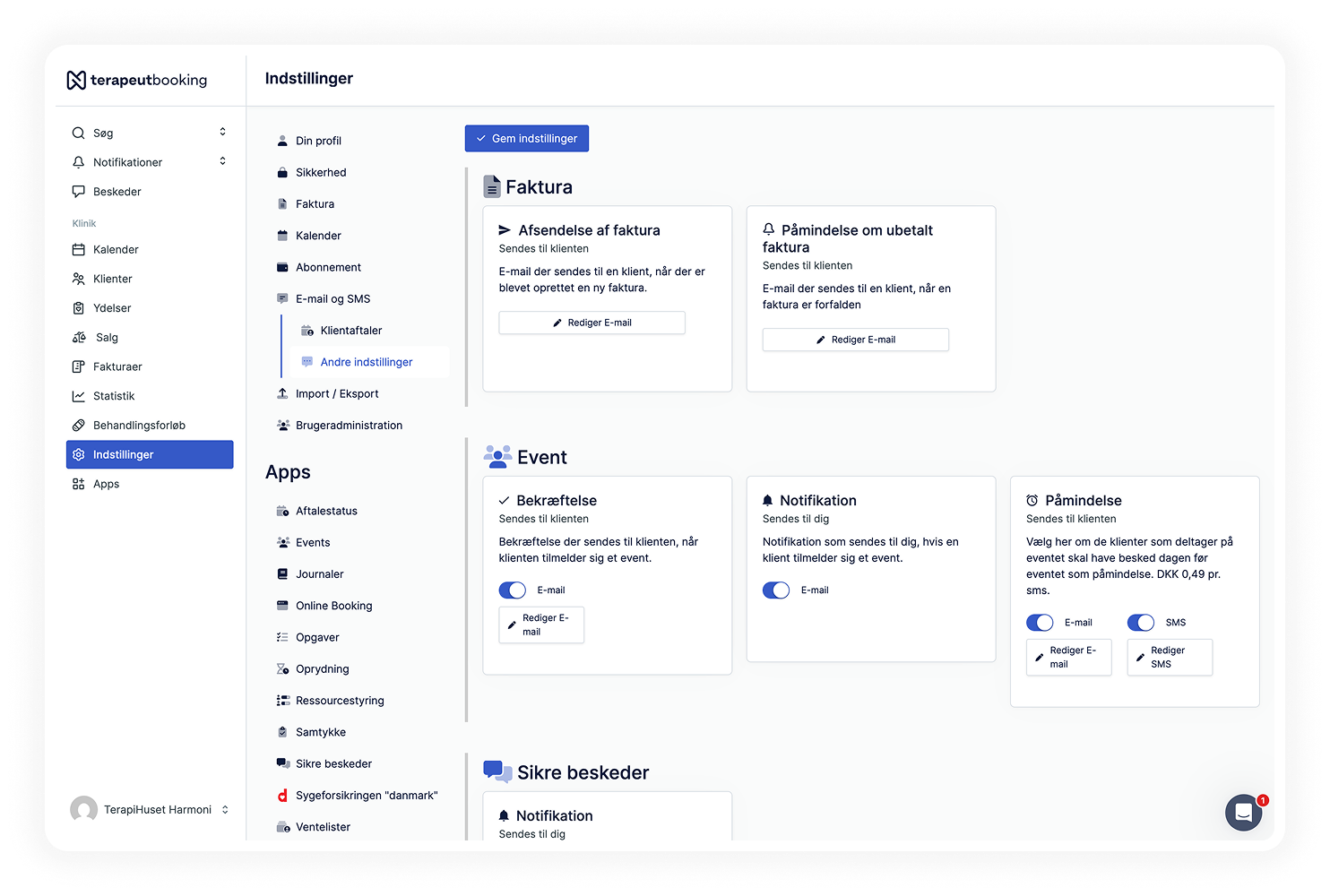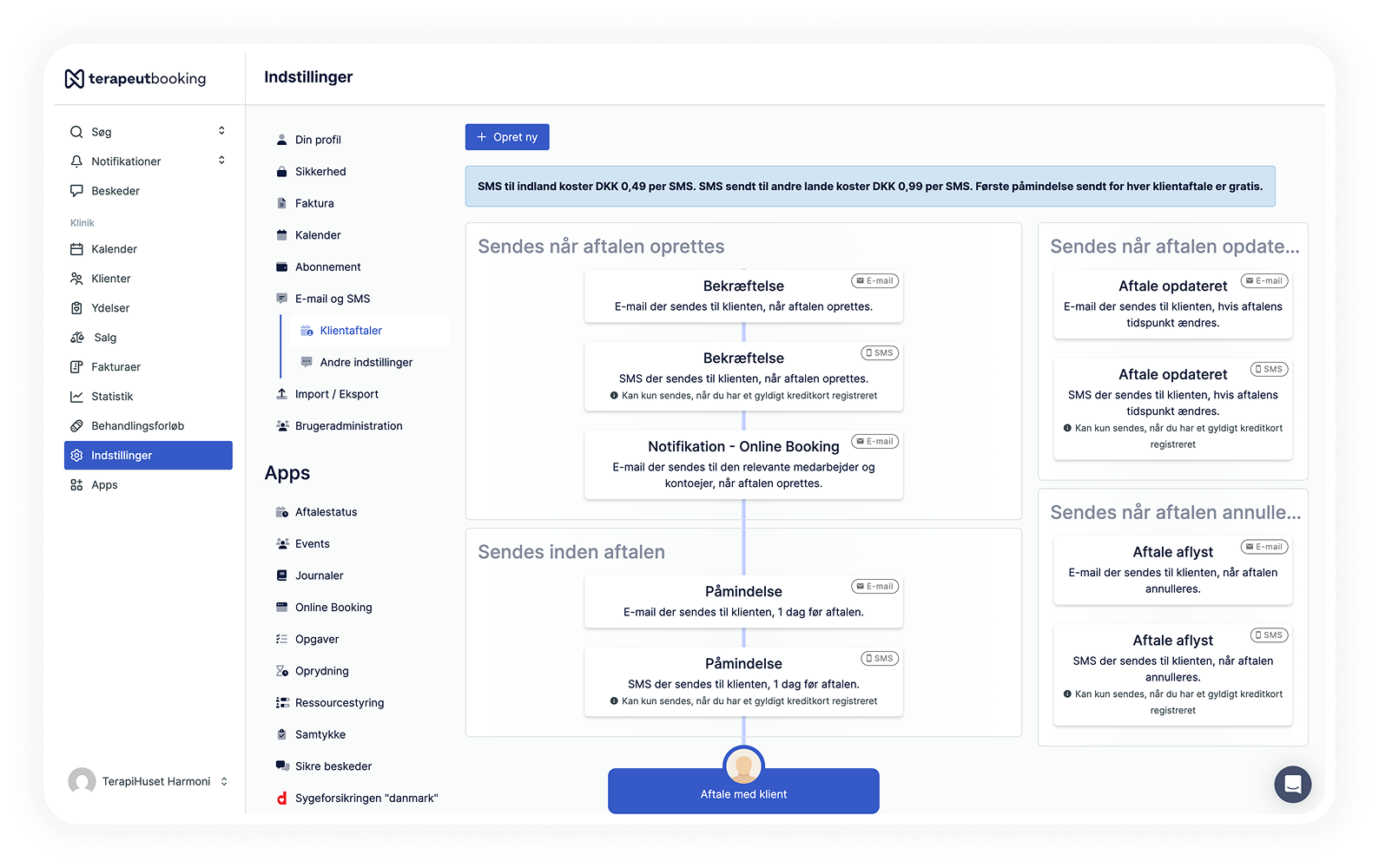 Udgående SMS’er og e-mails fra Terapeut Booking kan tilpasses fuldstændig til din klinik og dit arbejdsflow. Du sætter selv betingelser, præferencer og regler for hver beskedtype – så kommunikationen altid passer til dine klienter.