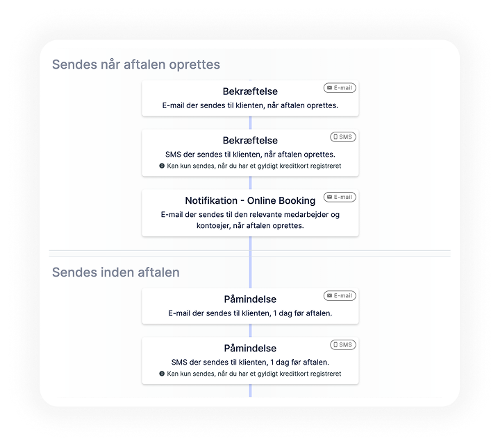 Når først dit indhold og præferencer er sat op, klarer systemet resten helt automatisk. Påmindelser, bekræftelser og beskeder sendes ud uden, at du behøver røre en finger – og du kan altid justere eller tilføje nye flows, hvis dine behov ændrer sig.