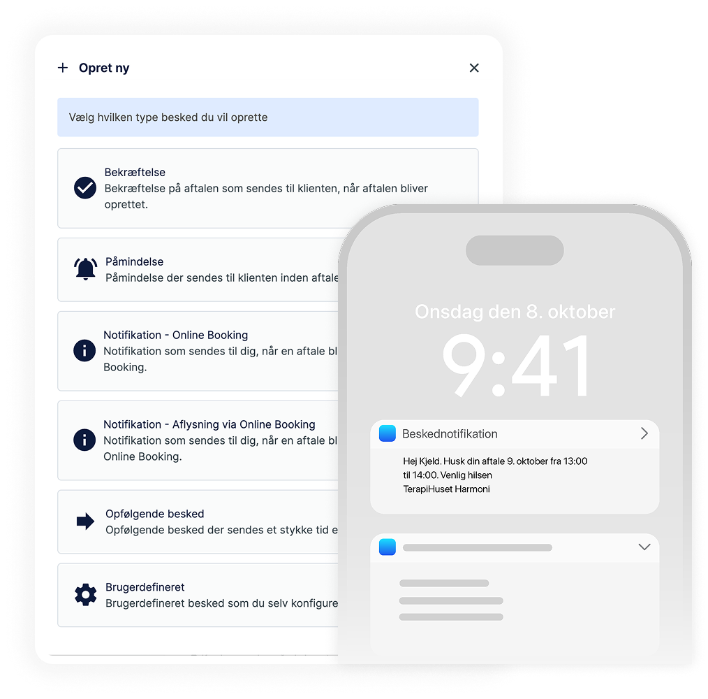 Det hele kan opsættes direkte i systemet. Du bestemmer, hvad der skal stå, hvornår det skal sendes, og hvor mange beskeder klienten skal modtage. Der er ingen grænser for, hvor personlig og fleksibel din kommunikation kan være – fra den første booking til det sidste opfølgende forløb.