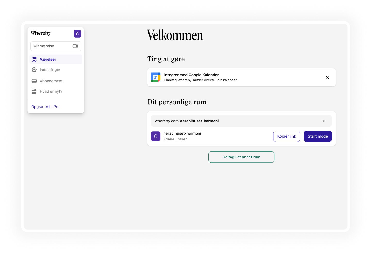 - Hvis du foretrækker det, kan du bruge Whereby dansk interface
