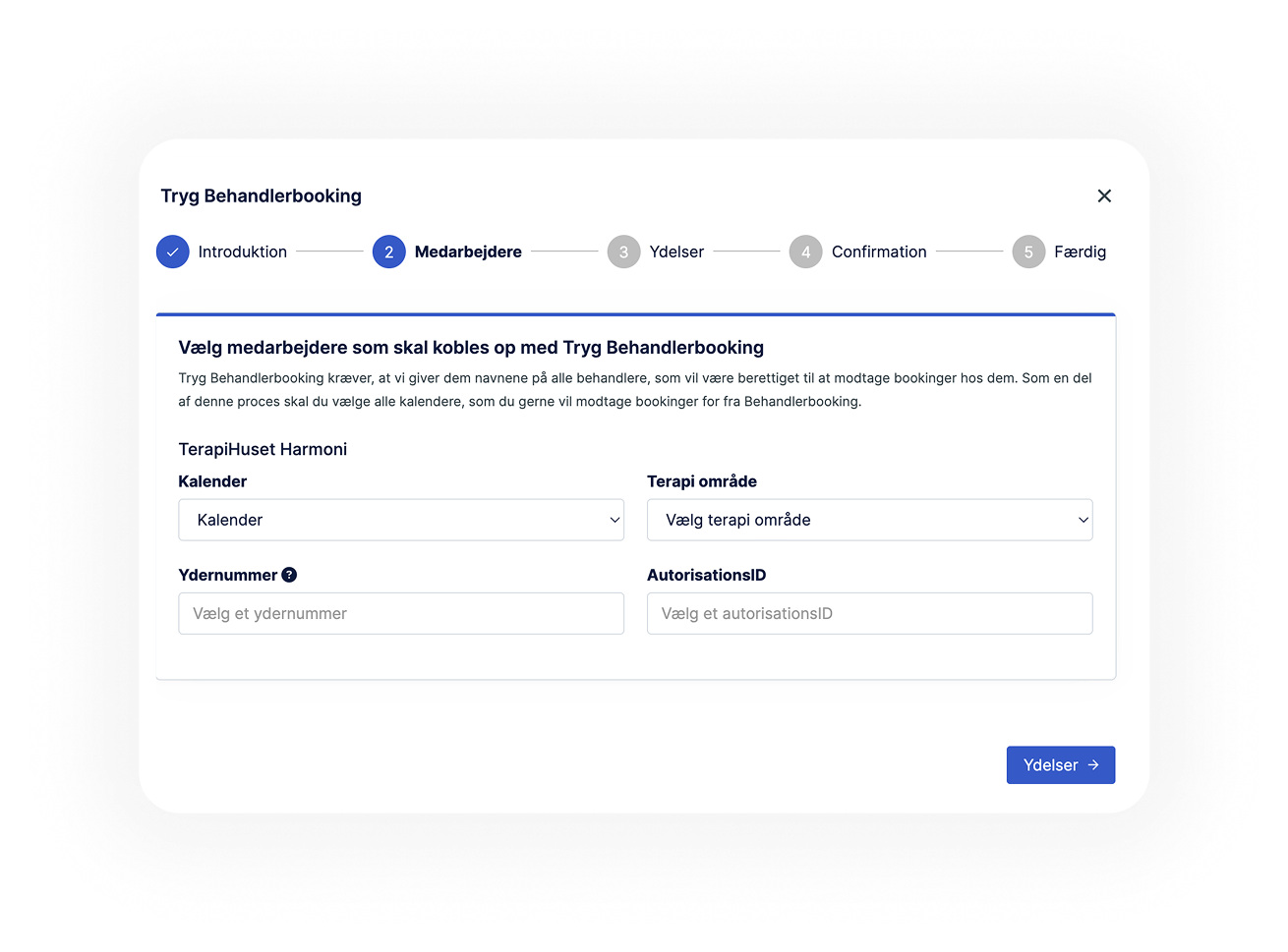Når du har aktiveret integrationen i Terapeut Booking, bliver dine relevante ydelser og kalendere koblet sammen med Tryg.