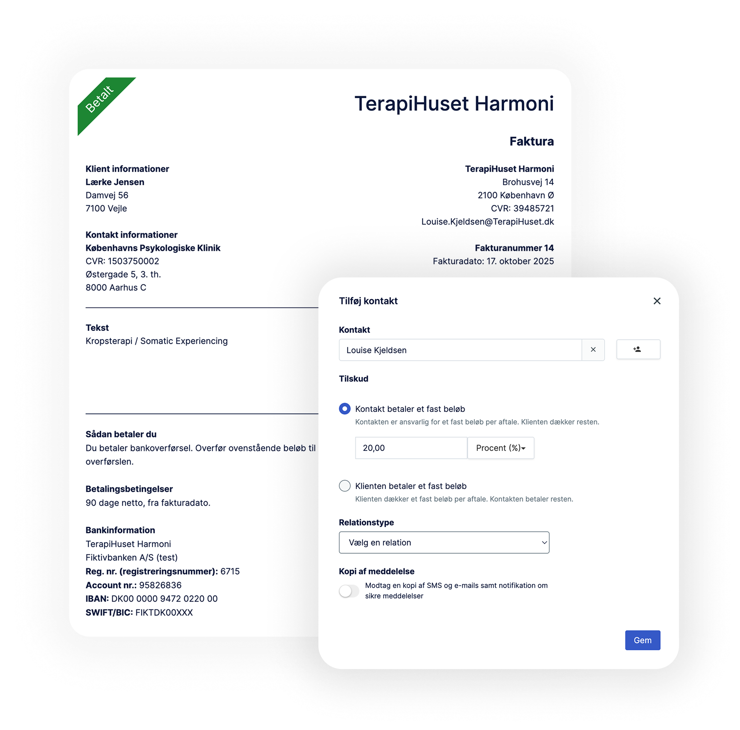 For fysioterapeuter oprettes automatisk en split-faktura, hvor Tryg betaler deres andel, og klienten betaler resten.